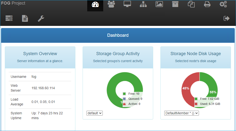 Grâce a des documents comme:https://chrtophe.developpez.com/tutoriels/deploiement-fogproject ou https://lofurol.fr/joomla/logiciels-libres/339-installation-dun-serveur-fog-dans-virtualbox et mes connaissance j’ai pu mettre en place Fog et comprendre son utilités aux sein d’une infrastructure remplis de matériel informatique. Ca ma permis de comprendre que l’optimisation du temps est un grand avantages au sein de notre domaine de spécialisation, l’outil Fog est très facile a prendre en main même pour ca compréhension. Voici une image pour vous donnez un aspect visuel de l’interface de Fog.